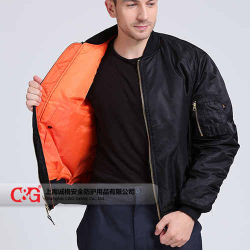 內(nèi)里采用高可視度的橘紅色面料;一旦飛行員迫降,逃離后,只要將夾克反穿,變成一件救生衣,便于空中搜救人員發(fā)現(xiàn)。