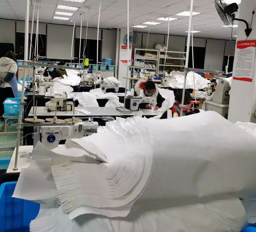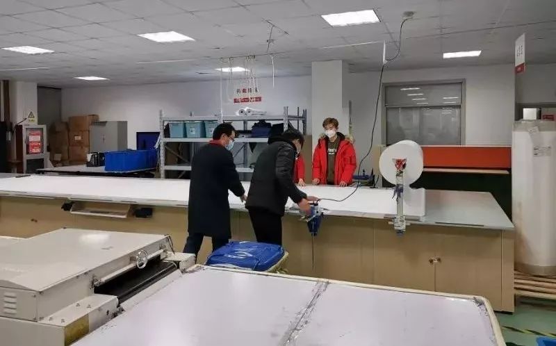 最終走訪了3家企業(yè),才將15臺(tái)拷邊機(jī)湊齊。當(dāng)晚,周浦鎮(zhèn)產(chǎn)業(yè)園連夜把機(jī)器運(yùn)回誠(chéng)格工廠。深夜3點(diǎn),廠房消毒完畢,設(shè)備組裝調(diào)試維修完畢,打樣確認(rèn)準(zhǔn)備生產(chǎn)完畢。